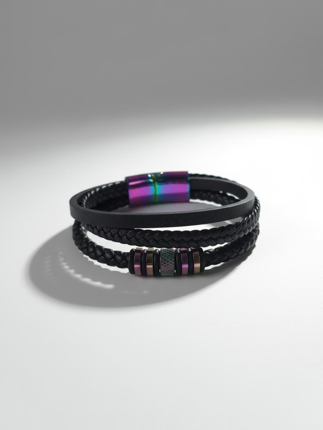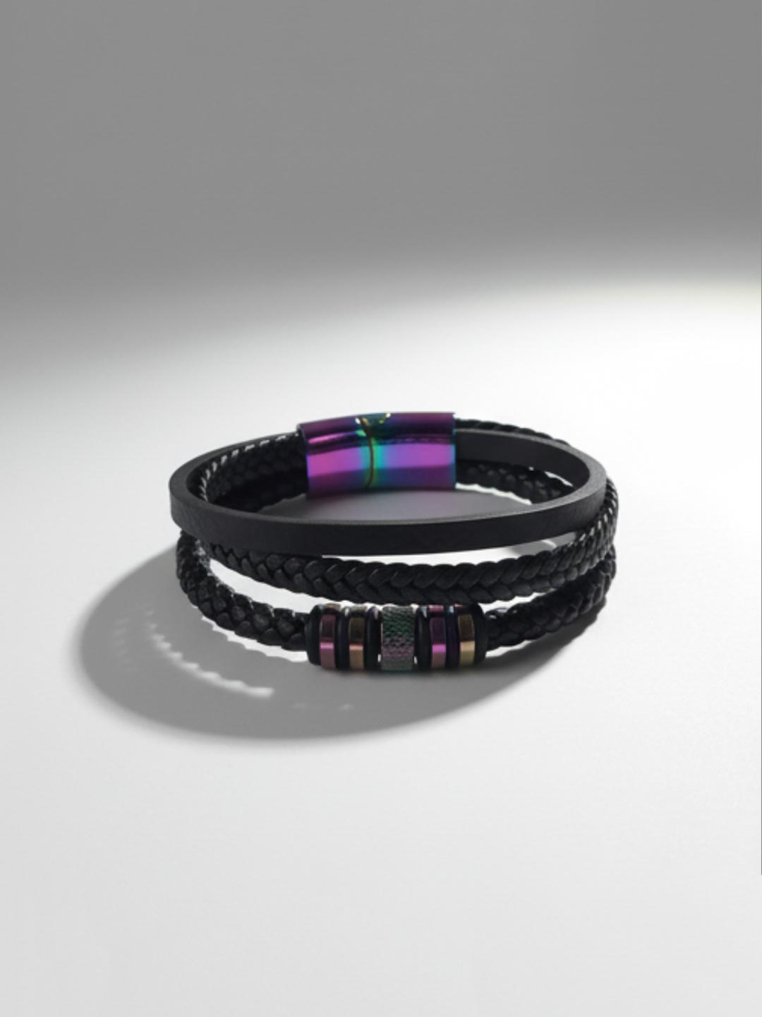 Unleash your inner edge with Auric, a bold fusion of modern masculinity and mystic charm. Crafted with premium braided leather and accented by a radiant aurora-finish clasp, this bracelet is designed to elevate every look — from casual to classy. Its free-size design ensures a perfect fit for him, while the intricate detailing and iridescent metal accents add a touch of mystery and sophistication.