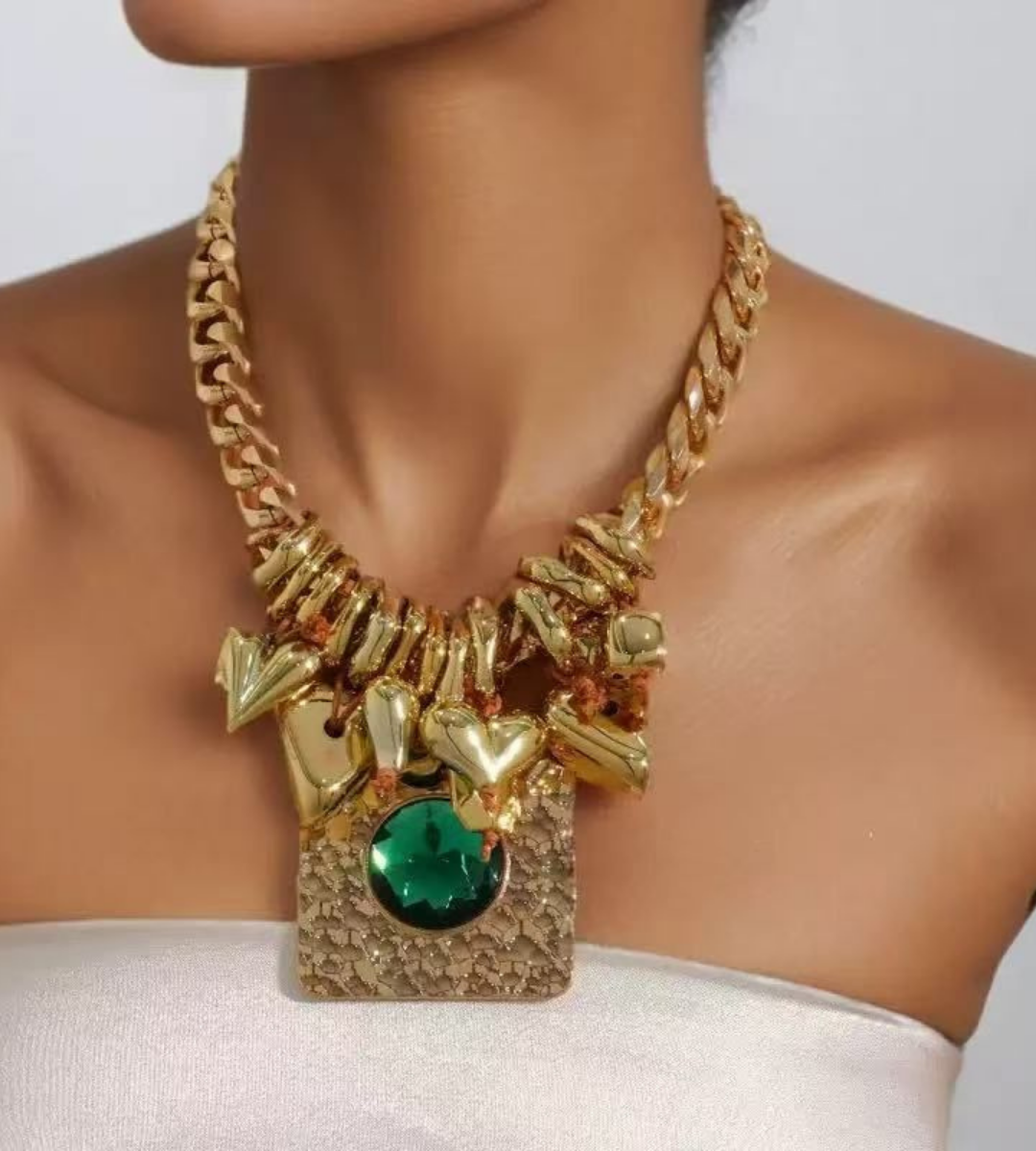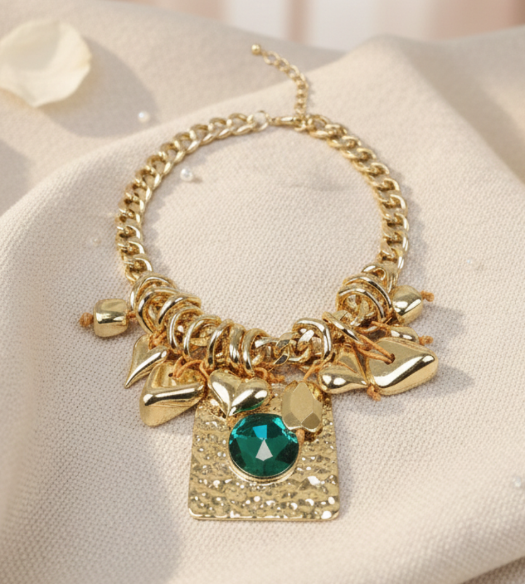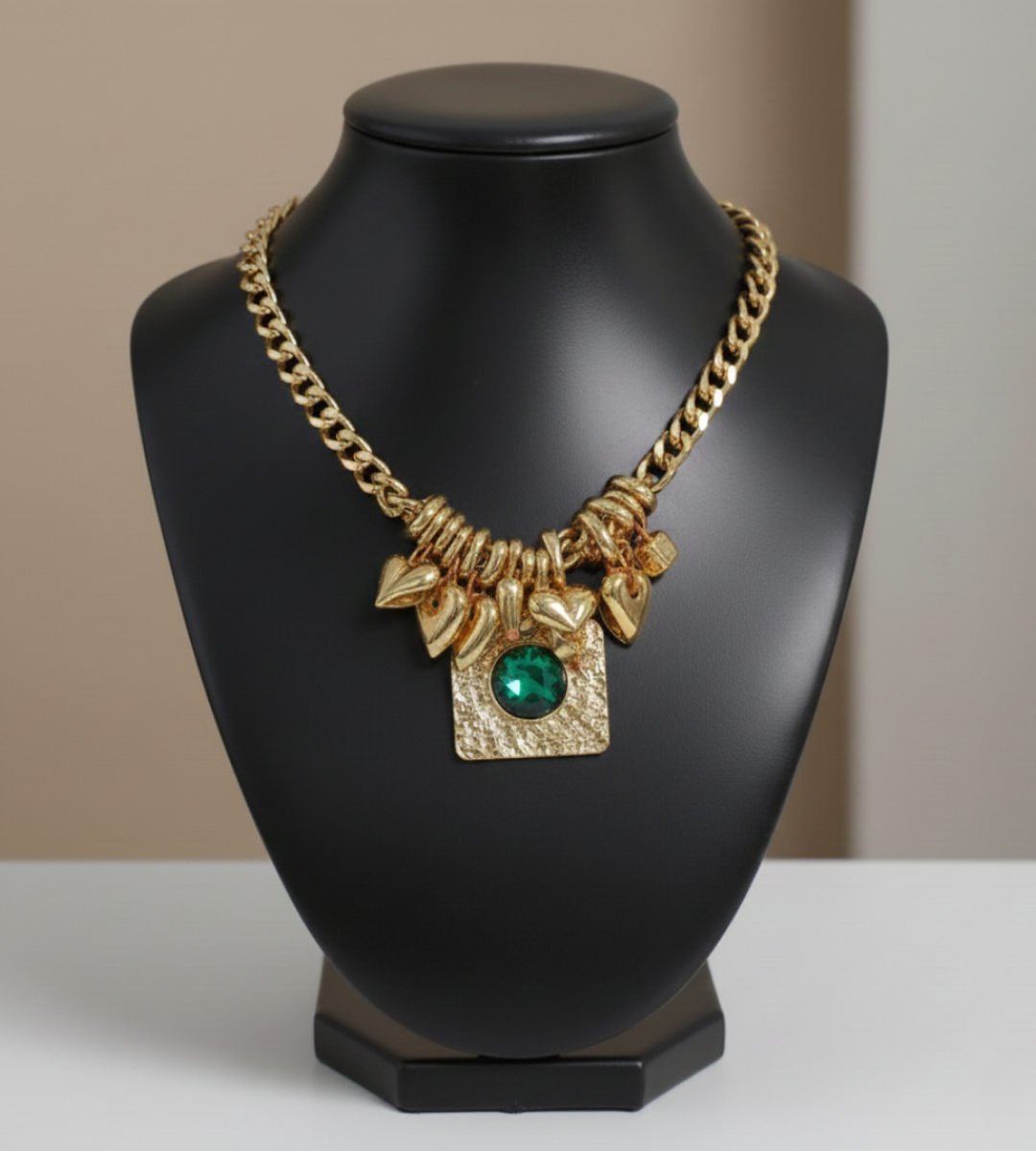 Channel bohemian luxury with the Emerald Heart Hammered Statement Necklace. This eclectic piece features a bold, square pendant with a rugged hammered texture, centered by a brilliant emerald-green crystal that captures the light from every angle. Flanking the central pendant are multiple polished gold-tone heart charms, suspended by rustic twine for a unique, handcrafted feel. Set on a chunky curb chain, this necklace perfectly balances raw, artisanal details with high-shine glamour.