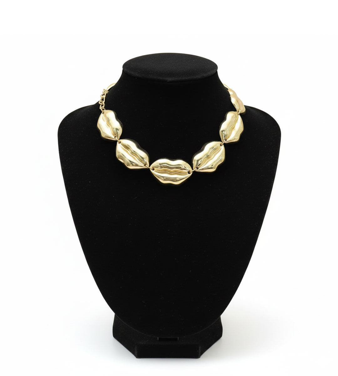 Bold, artsy, and undeniably chic—Lipcraft features a sculpted, lip-inspired design crafted in a glossy gold finish. Its chunky, abstract form adds instant drama, making it the perfect statement piece for parties, evenings out, or elevating a simple outfit. Trendy yet timeless, this choker brings a playful edge with a luxe touch.
