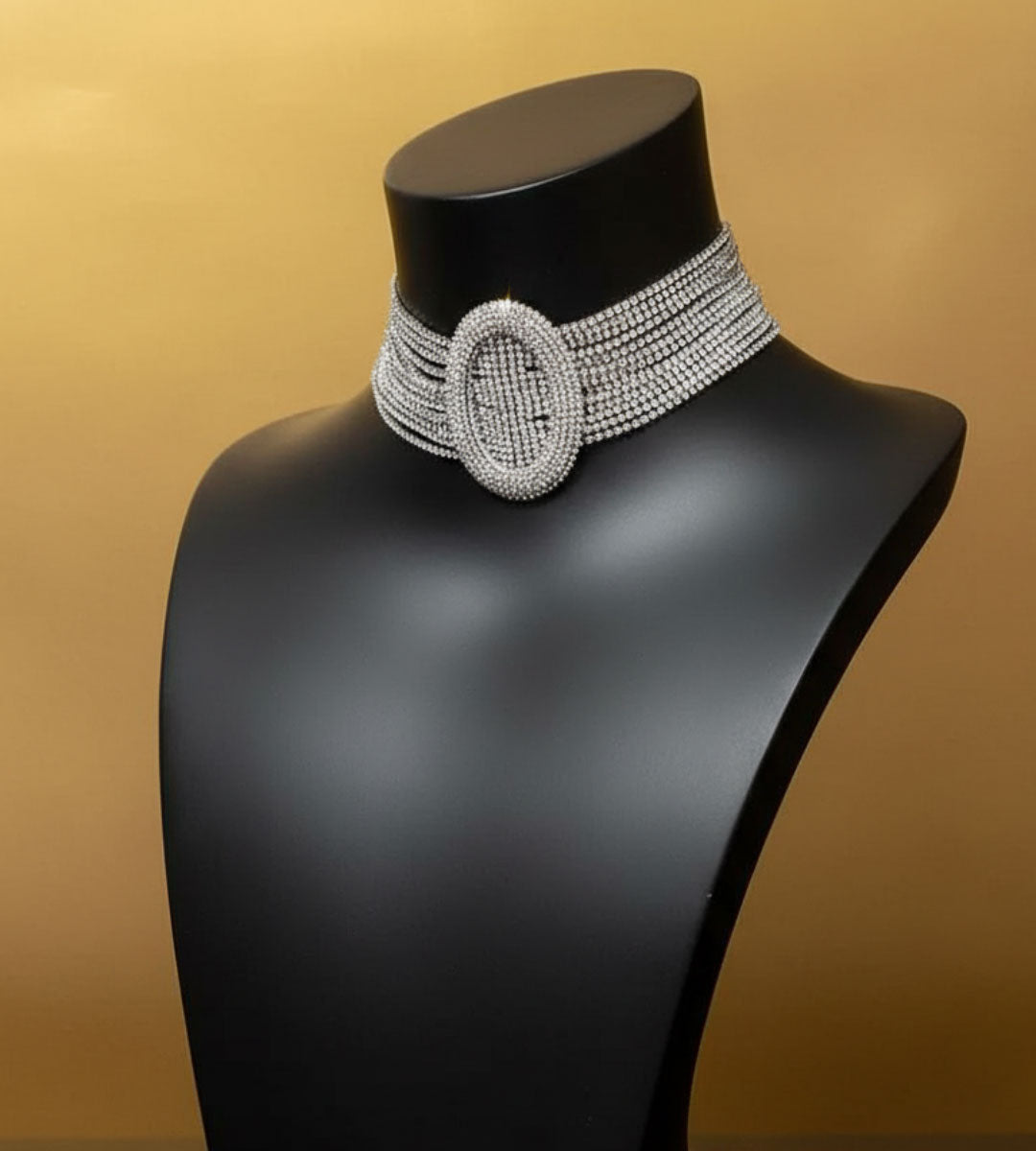 Illuminate every moment with Luminare, a statement neckpiece designed to captivate from every angle. Crafted with rows of sparkling stones and a bold, oval centerpiece, this choker reflects light beautifully—giving you a radiant, high-glamour glow wherever you go.