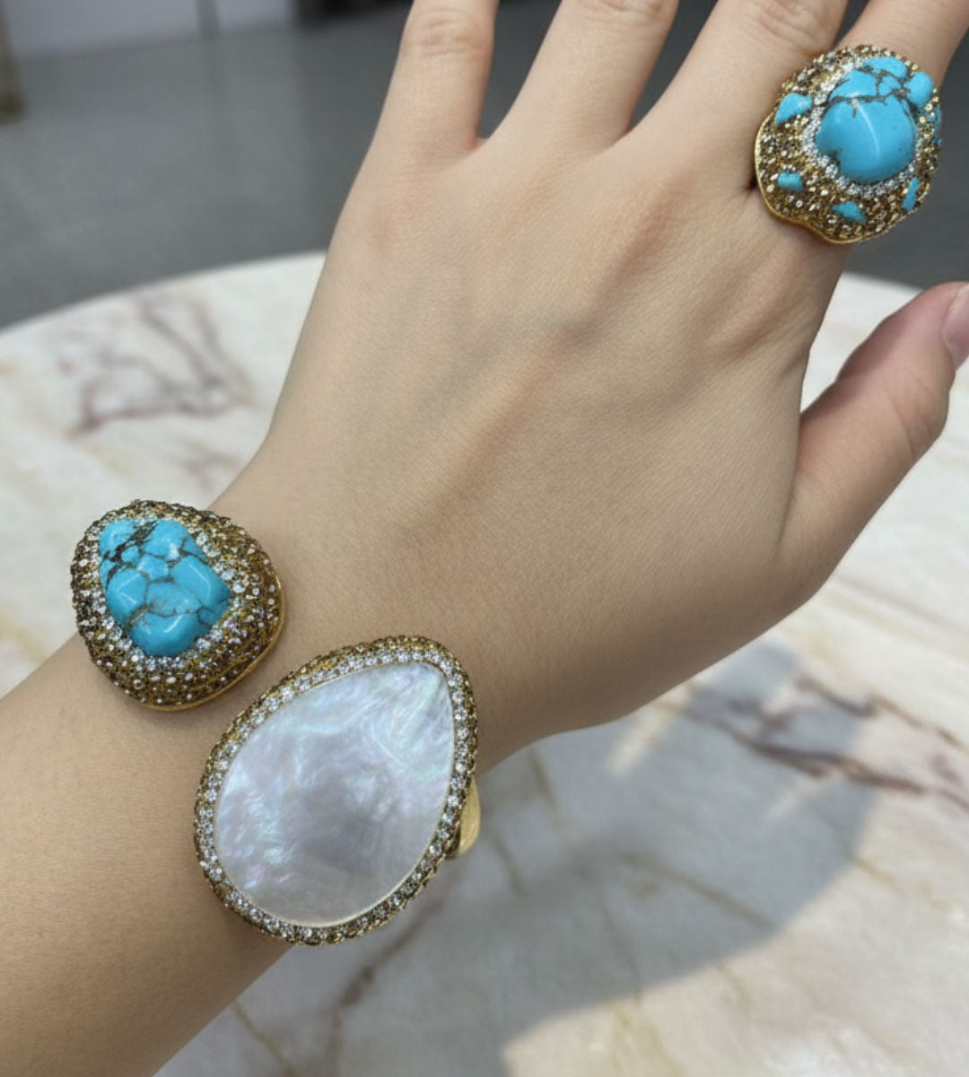 Elevate your look with Seastone, a striking jewelry set crafted with a bold blend of turquoise and mother-of-pearl. The vibrant blue stone brings a raw, ocean-inspired charm, while the iridescent white stone adds a soft, luminous elegance. Both pieces are framed with shimmering crystal detailing, giving the set a luxurious, eye-catching finish.